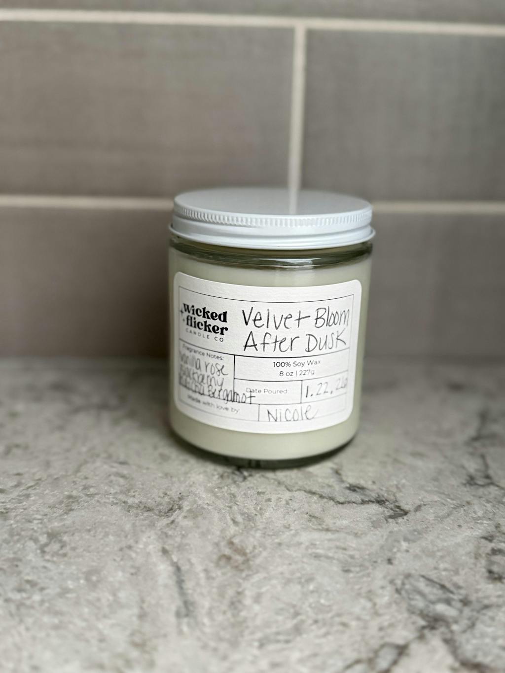 Due to the nature of this handmade product, it is subject to flaws like off-center wicks, crooked labels. No two batches of candles are totally identical.